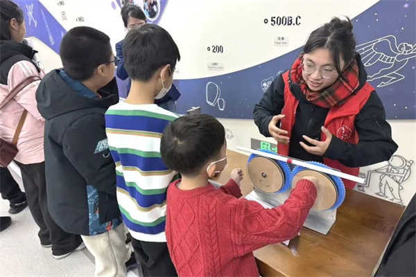 在舞台科普秀环节。借助光的偏振和折射原理打造的“光学魔术——隐身术”,让抽象的光学知识变得直观可感,孩子们惊叹于光影变幻的奇妙。“空气炮”闯关,“人体发电”活动,孩子们体验了团结力量大的意义。而在“碎碎平安”的声学实验中,通过声音振动的力量打碎玻璃杯,更是直观呈现出声学特性,让孩子们沉浸式领略到声音里的科学奥秘,现场欢呼声与掌声不断。孩子们在老师的指导下,亲手操作展品、深度探究原理,在动手实践中贯通跨学科知识,将课堂上的物理概念转化为具象的体验,真正实现了寓教于乐、学以致用。