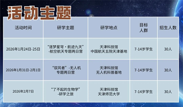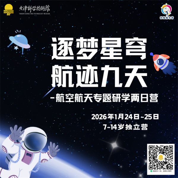 冬日启智,研学同行!为丰富青少年寒假生活,点燃科学探索热情,天津科技馆重磅推出“航空航天”“无人机”“生物学”三大主题精品研学活动。从深度探秘航天器到实操无人机的硬核体验,从探索宇宙深空的浩瀚到解码生物世界的微观奥秘,一场融合趣味、知识与实践的科学盛宴即将开启!天津科技馆邀你走进沉浸式研学课堂,解锁科学魅力,在实践中收获专属成长惊喜。