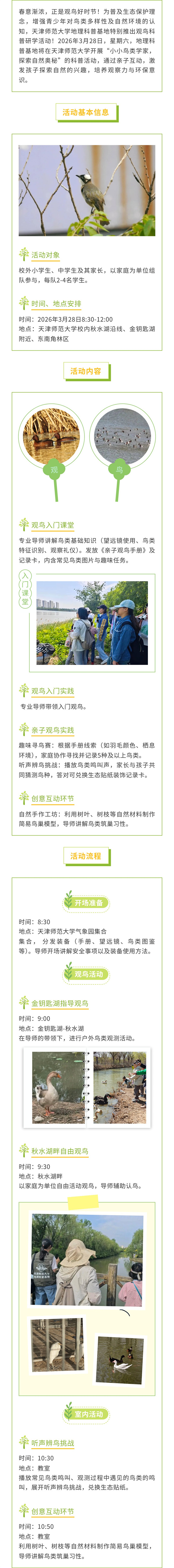 【惠玩攻略】天津师范大学地理科普基地“小小鸟类学家,探索自然奥秘”科普研学活动正在招募
