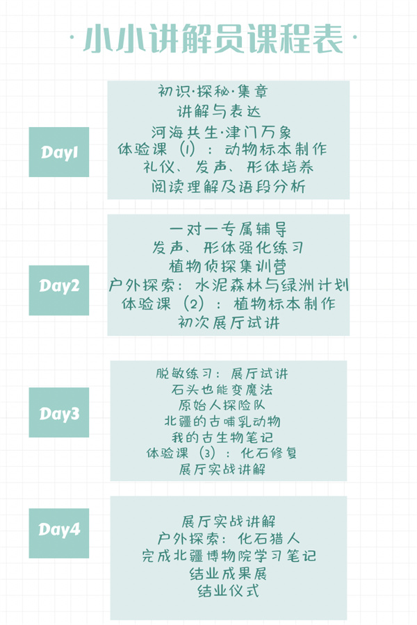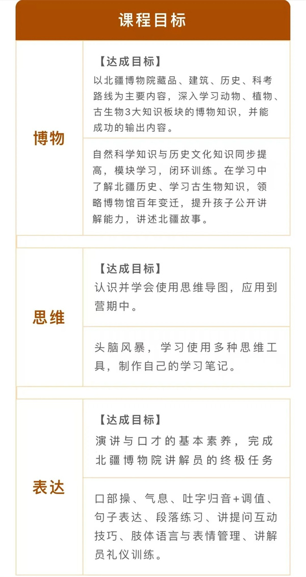 以“博古通津”为主题,实现科学与文化双线并行:将天津特有的自然地理与博物院深度融合,既培养青少年的科学素养,又增强本土文化认同感。由天津自然博物馆动物、植物、古生物、模型标本室、化石修复室各部门专业老师打造专属课程,为孩子们深入解读藏品。